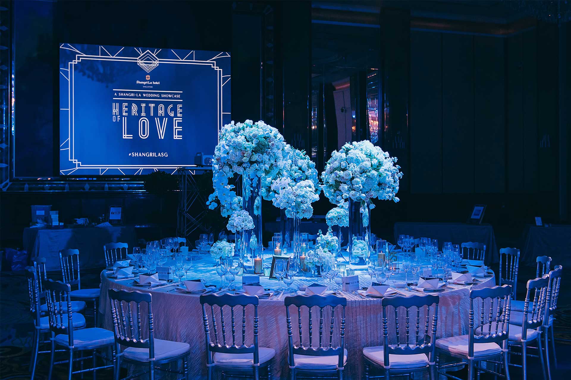 The Heritage of Love show is bold and blue, celebrating the sapphire anniversary of Shangri-la Hotel Singapore. Inspired by the sapphire gemstone, the central stage features sapphire crystal quartz and luxe glamourous themes that are flushed in bold blue lighting.