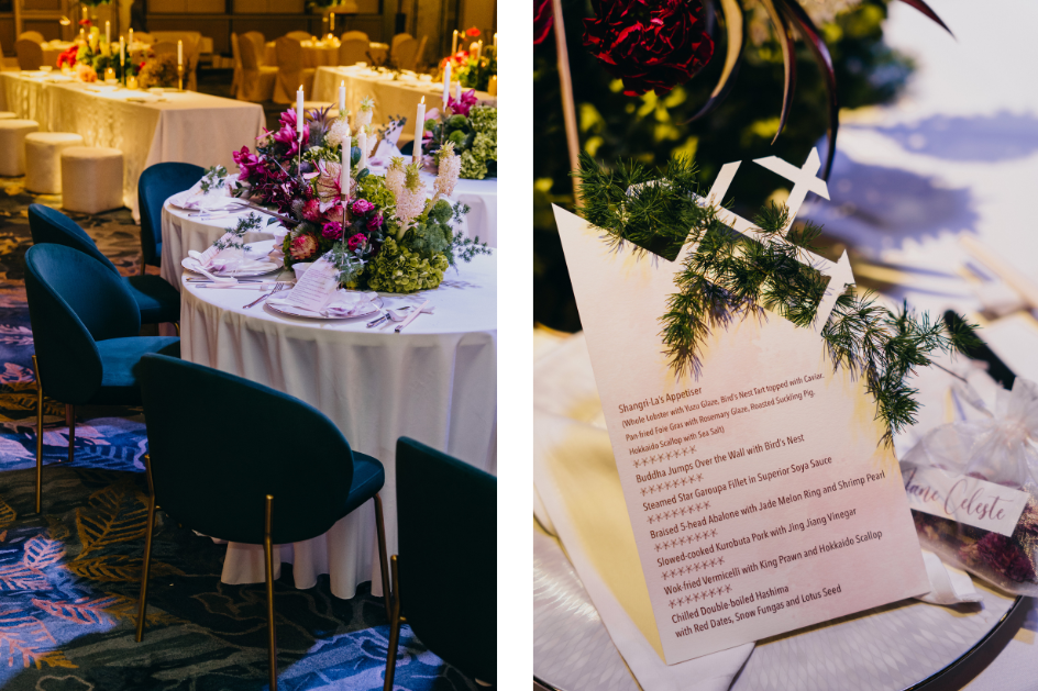 Your Wedding, Your Shangri-La: A Taste of Forever transformed the grand ballrooms of Shangri-La Singapore into a sensory epicurean journey, where the art of wedding planning was reimagined as an exquisite multi-course dining experience. The showcase invited couples to "savour" their future, beginning with a curated Amuse-Bouche of signature cocktails and personalized invitations that set a tone of bespoke luxury. As the journey unfolded, the venue blossomed into a cinematic dreamscape of moody, ethereal lighting and lush botanical installations, where wild greenery and delicate florals contrasted beautifully against the deep, regal tones of the Shangri-La’s iconic interiors.